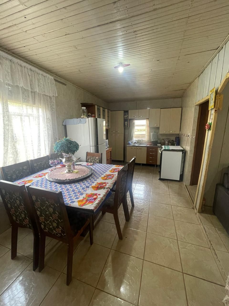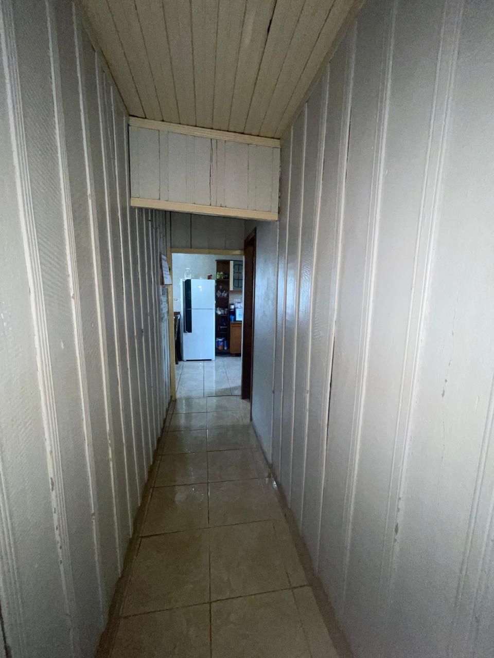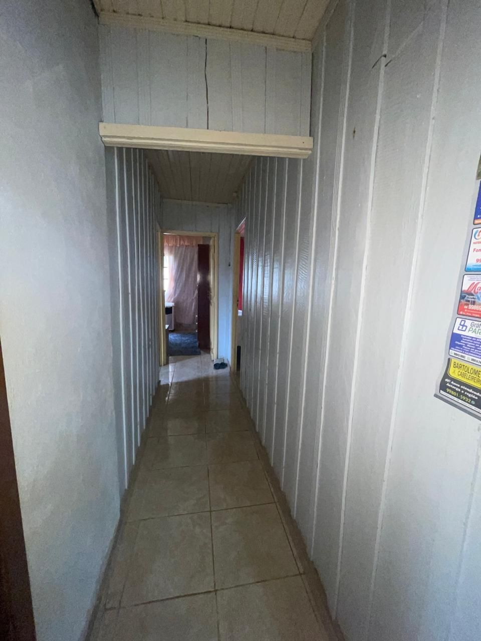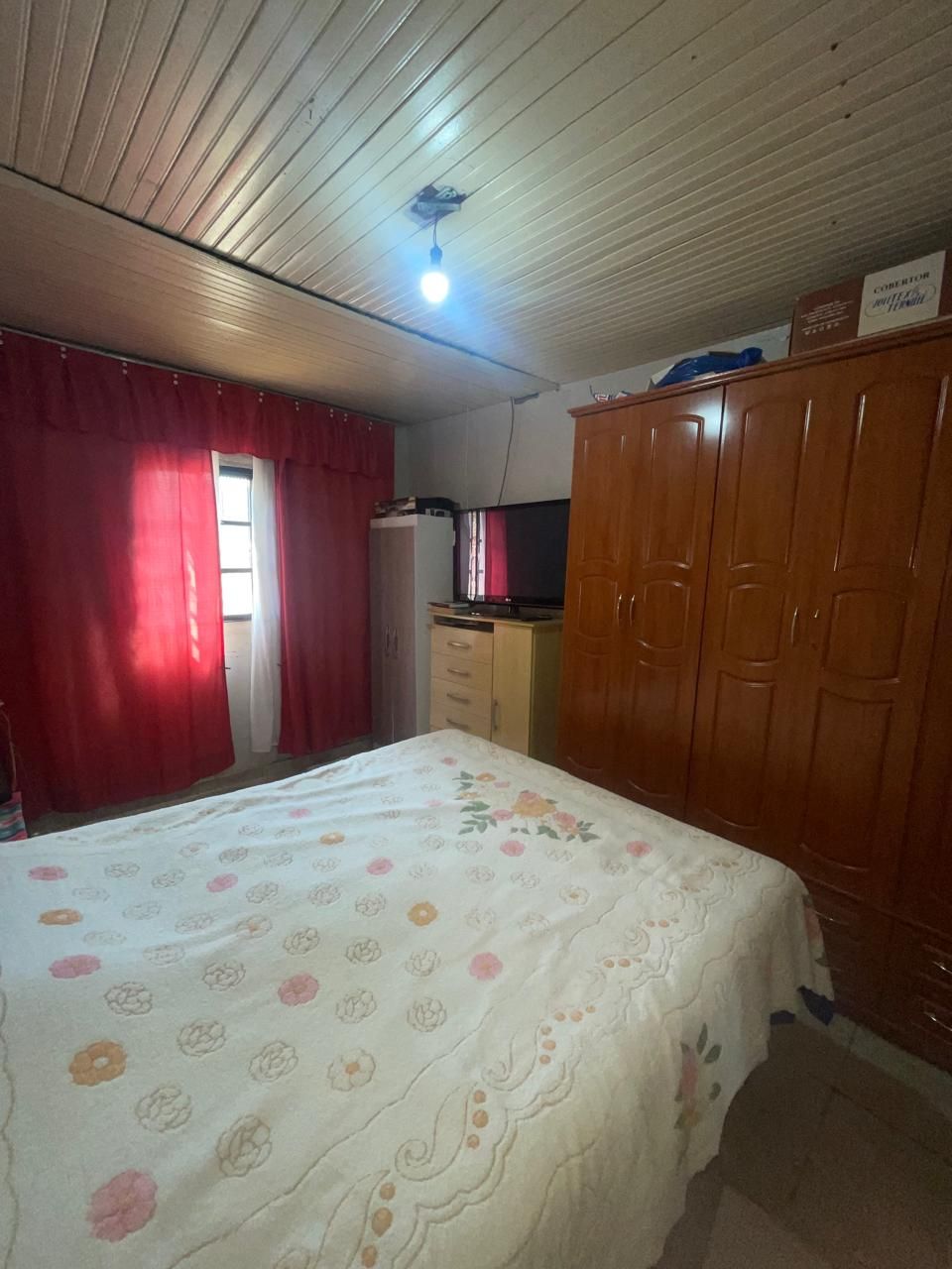 Residência mista (repartições internas de madeira), coberta por telhas e forração em madeira, contendo 3 quartos, sala cozinha, banheiro e garagem.