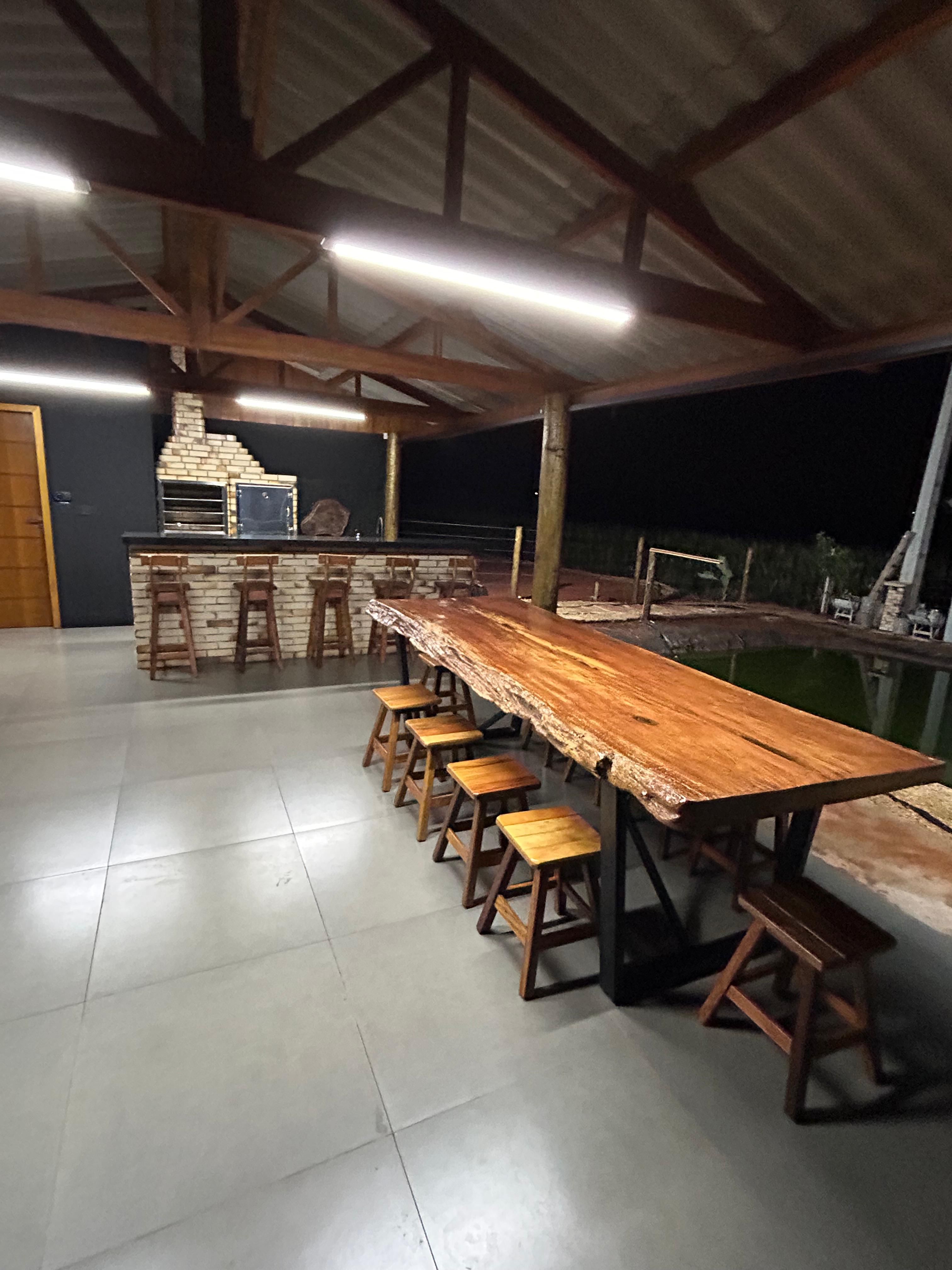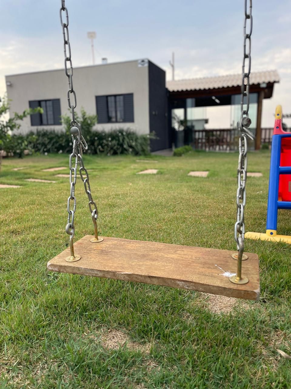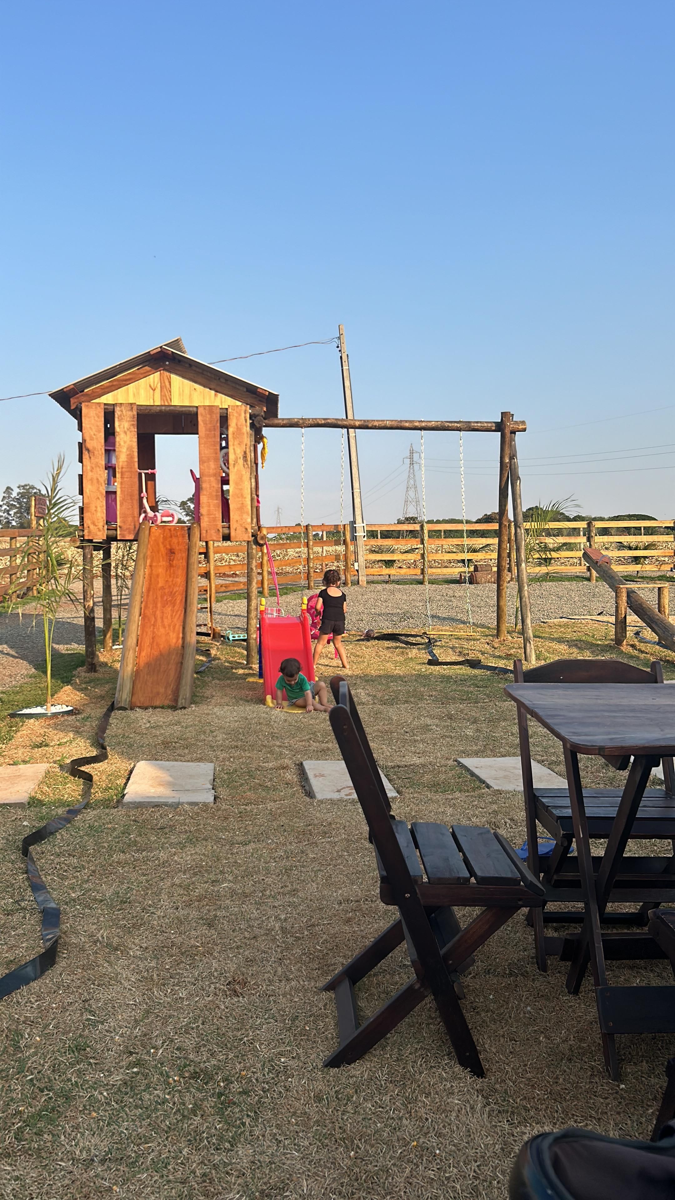Na área externa contem pergolado na borda da represa, parque para crianças com casa suspensa, escorregador, balanço e gangorra.