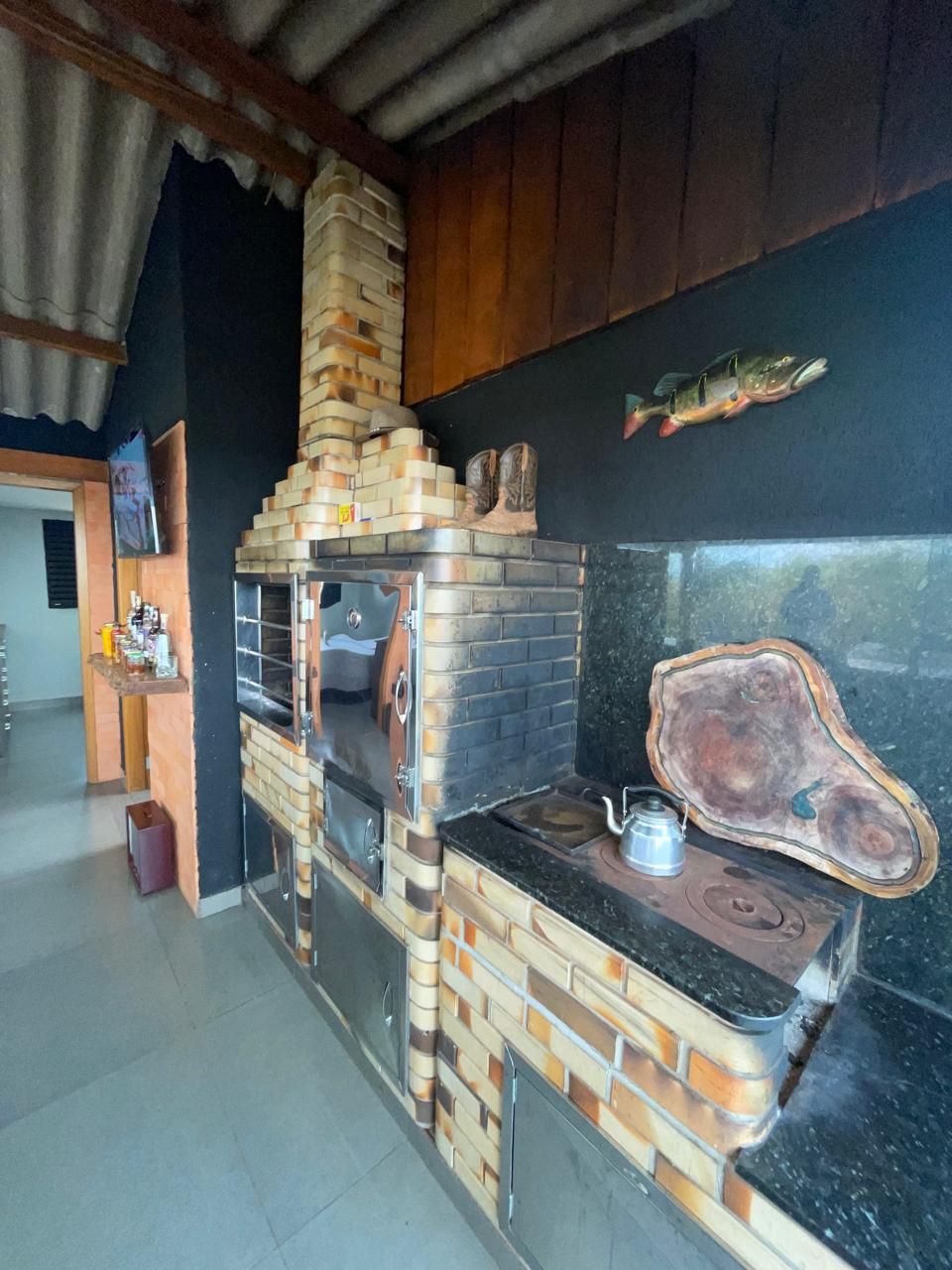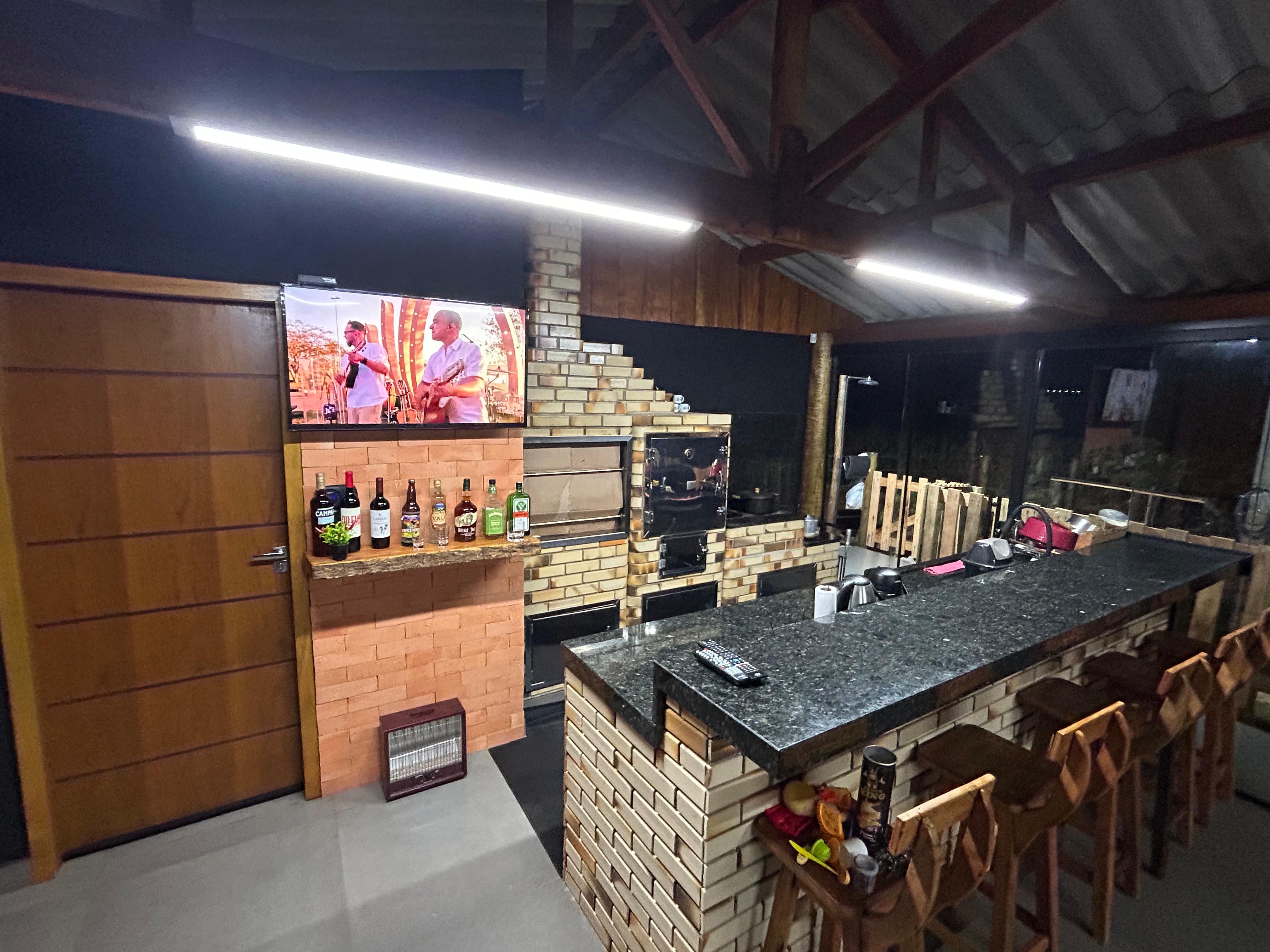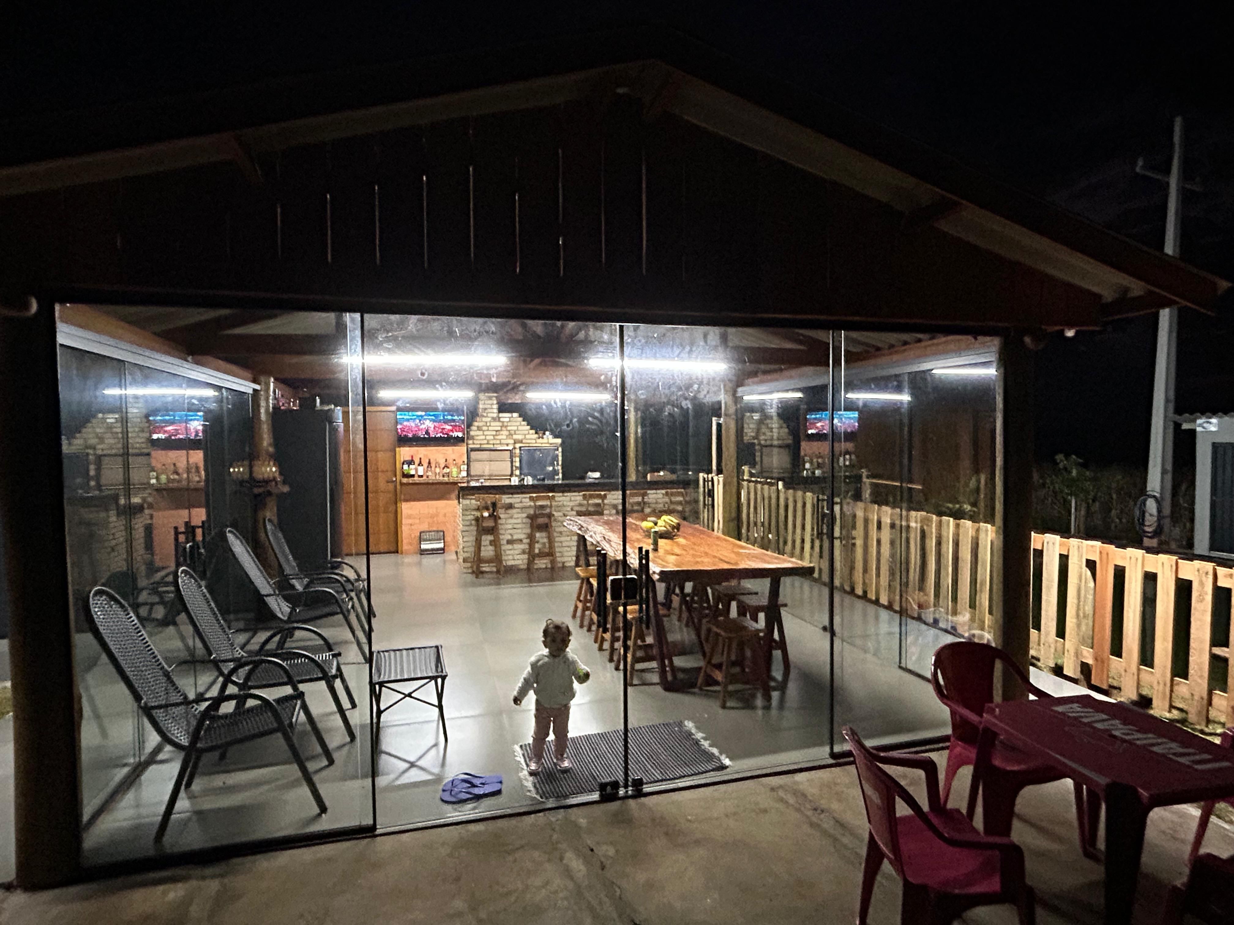 Espaço gourmet totalmente fechado por blindex, conta com móveis planejados, fogão a lenha e churrasqueira ambos de inox, cervejeira e tv.