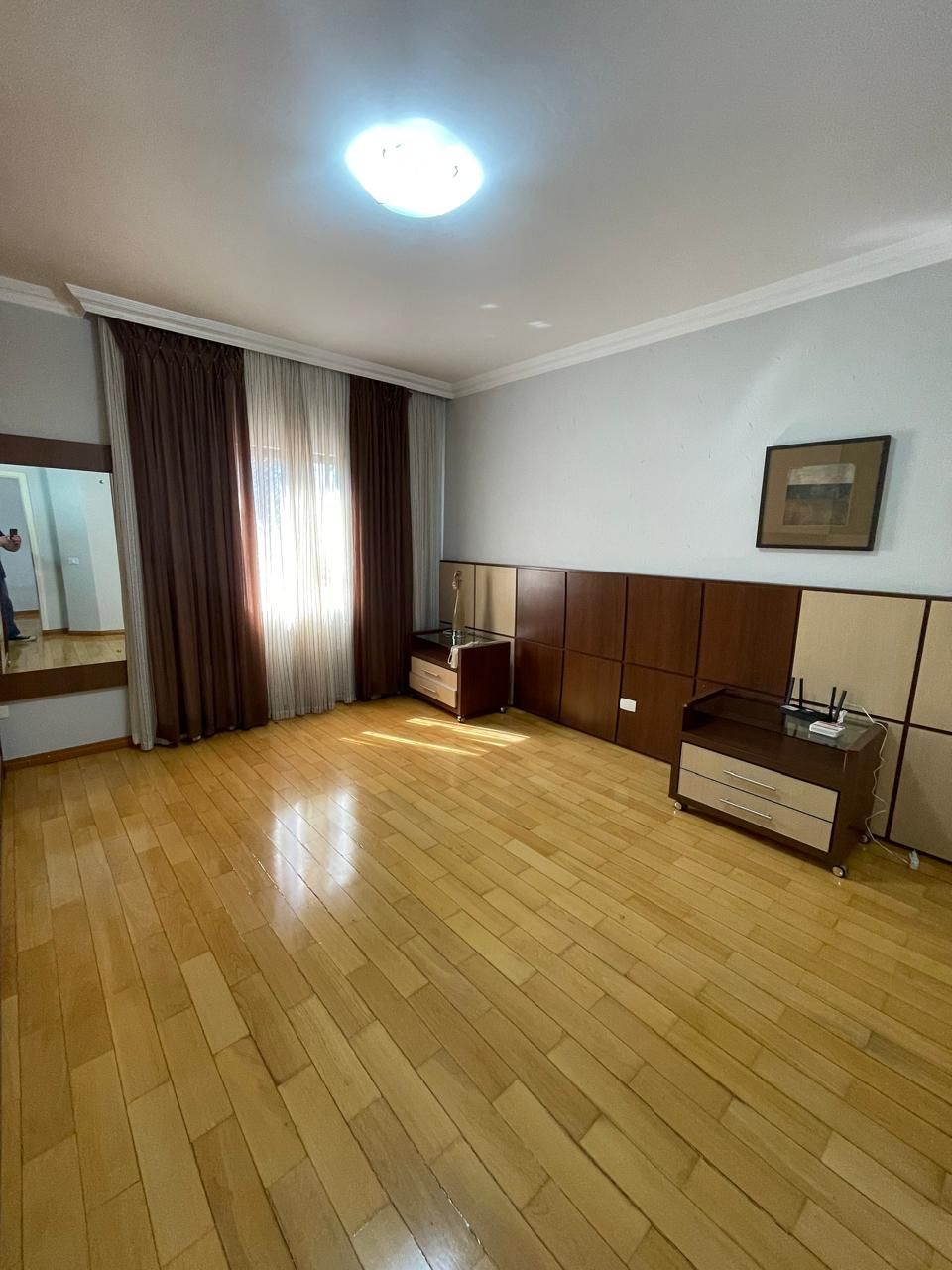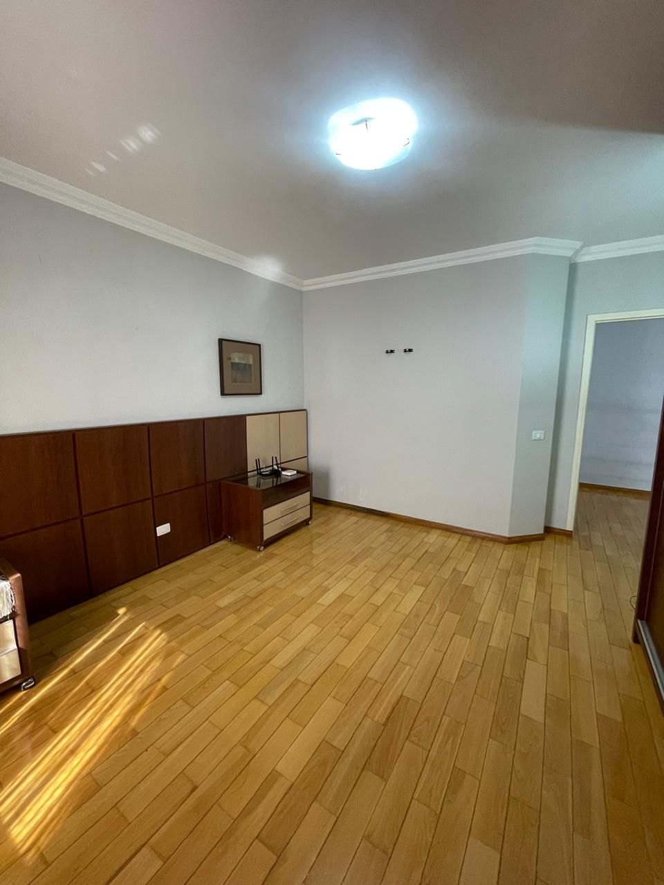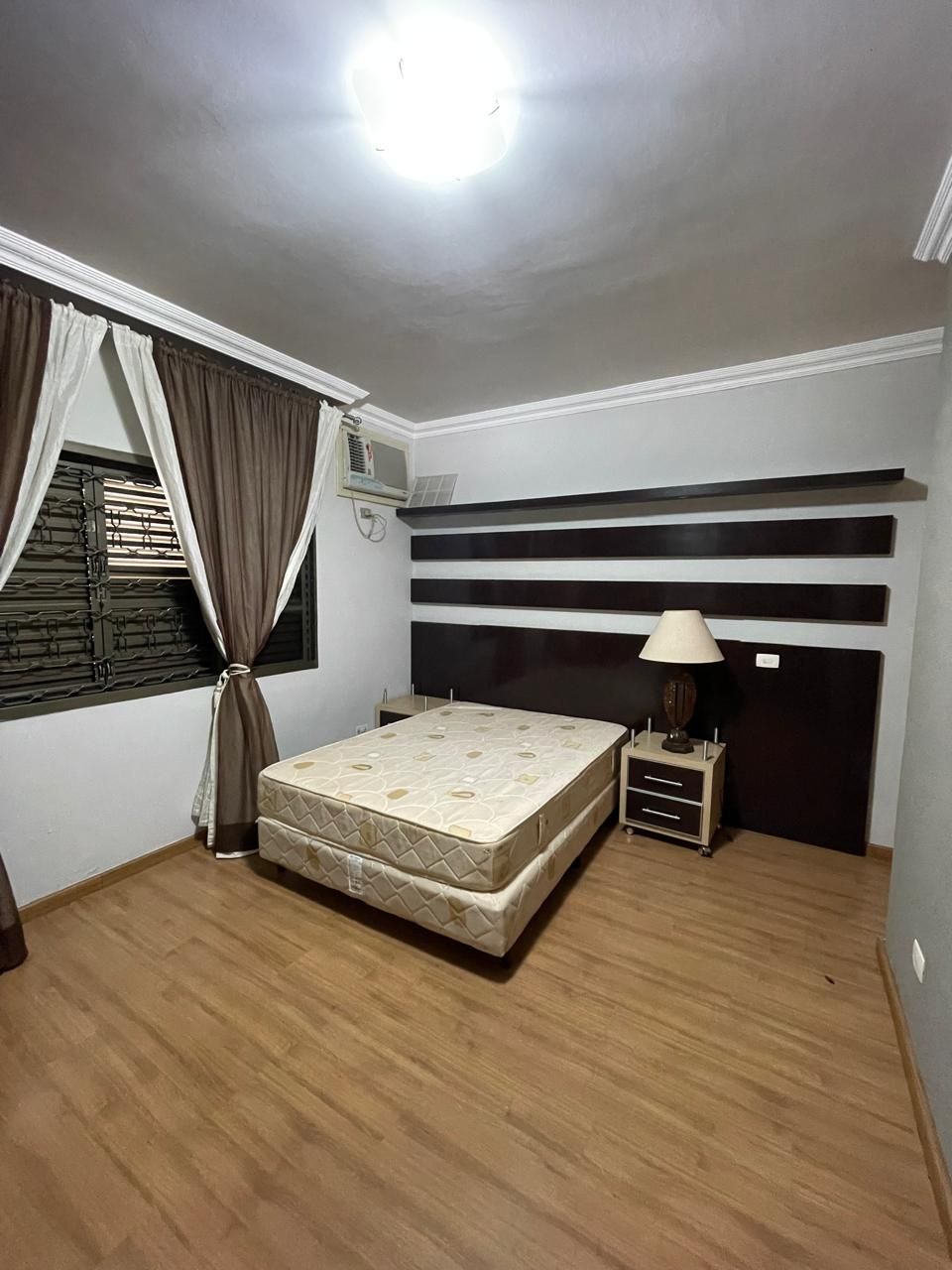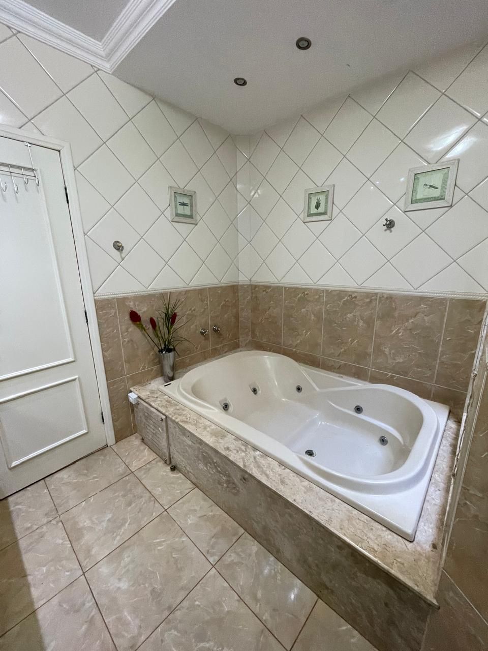 Suíte com armários, cama, mesinhas de cabeceira, ar condicionado, banheiro com banheira de hidromassagem dupla.